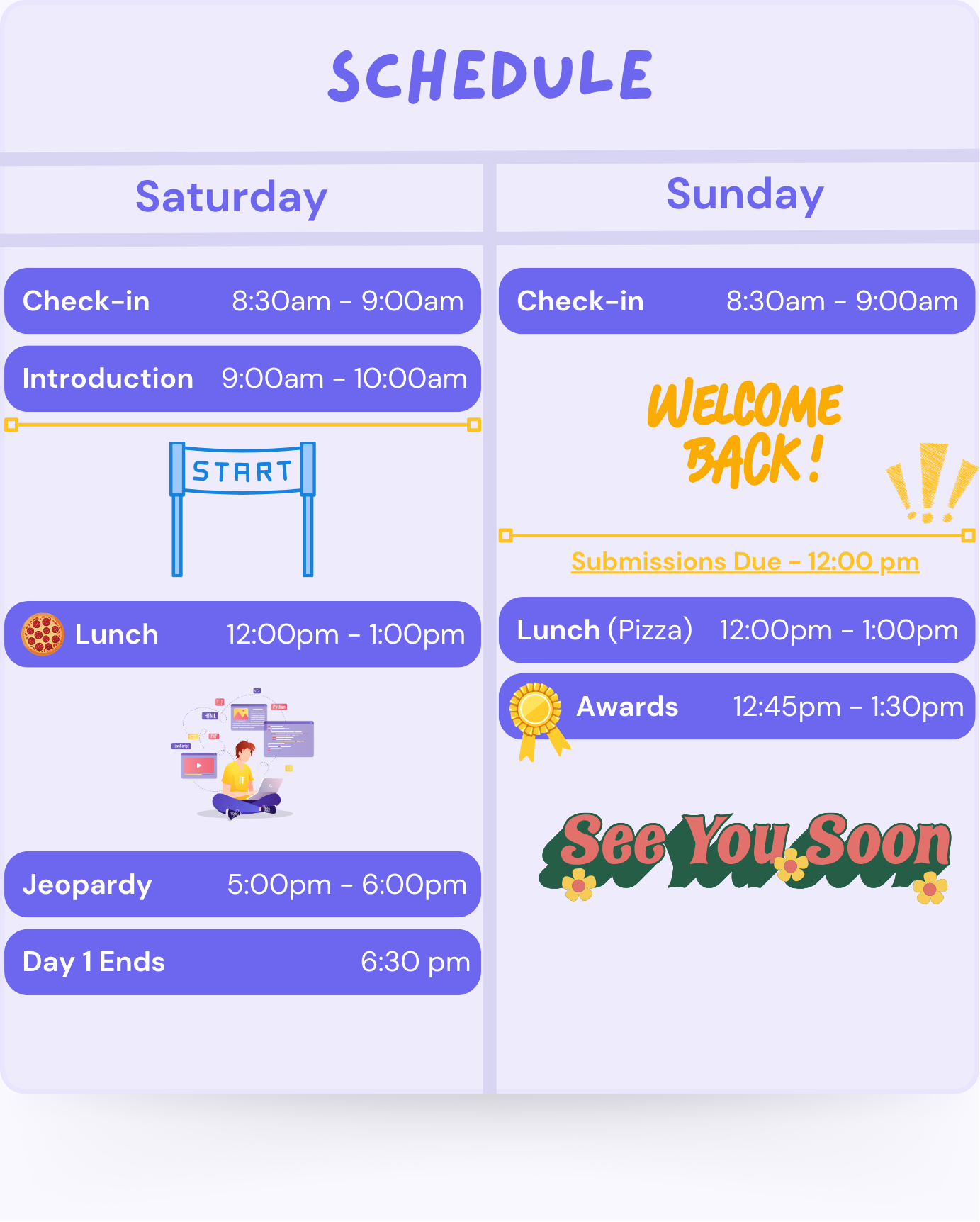 We encourage you to bring a laptop, chargers, and any necessary software pre-installed (IDEs, toolchains, etc.). Most importantly, come with a positive attitude and great energy for an amazing experience! Please note that we cannot provide hardware, so be sure to bring your own.